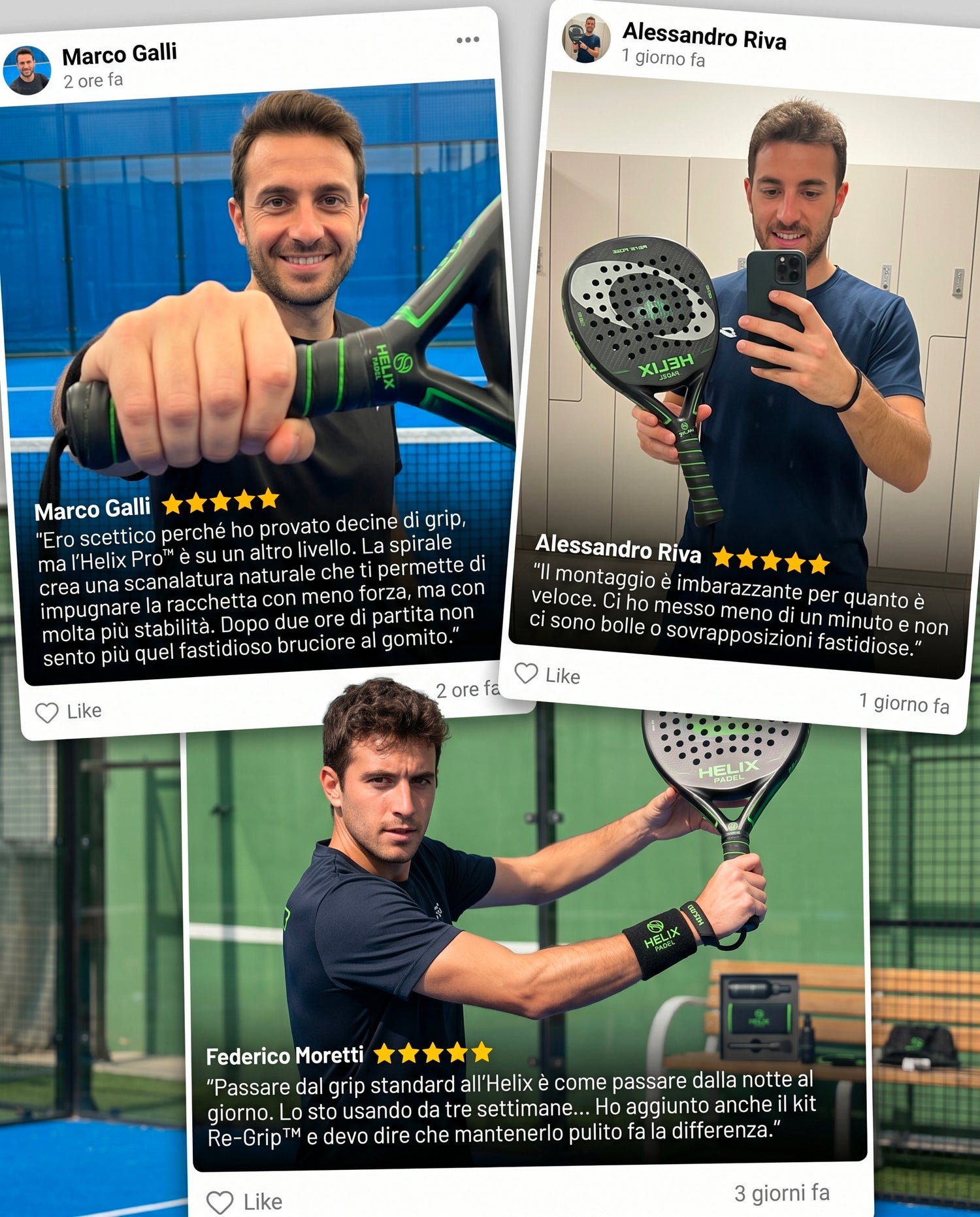 Non è solo un grip, è il nuovo standard in campo. Oltre 5.000 giocatori hanno già abbandonato i vecchi overgrip per passare alla tecnologia a spirale Helix Pro™.